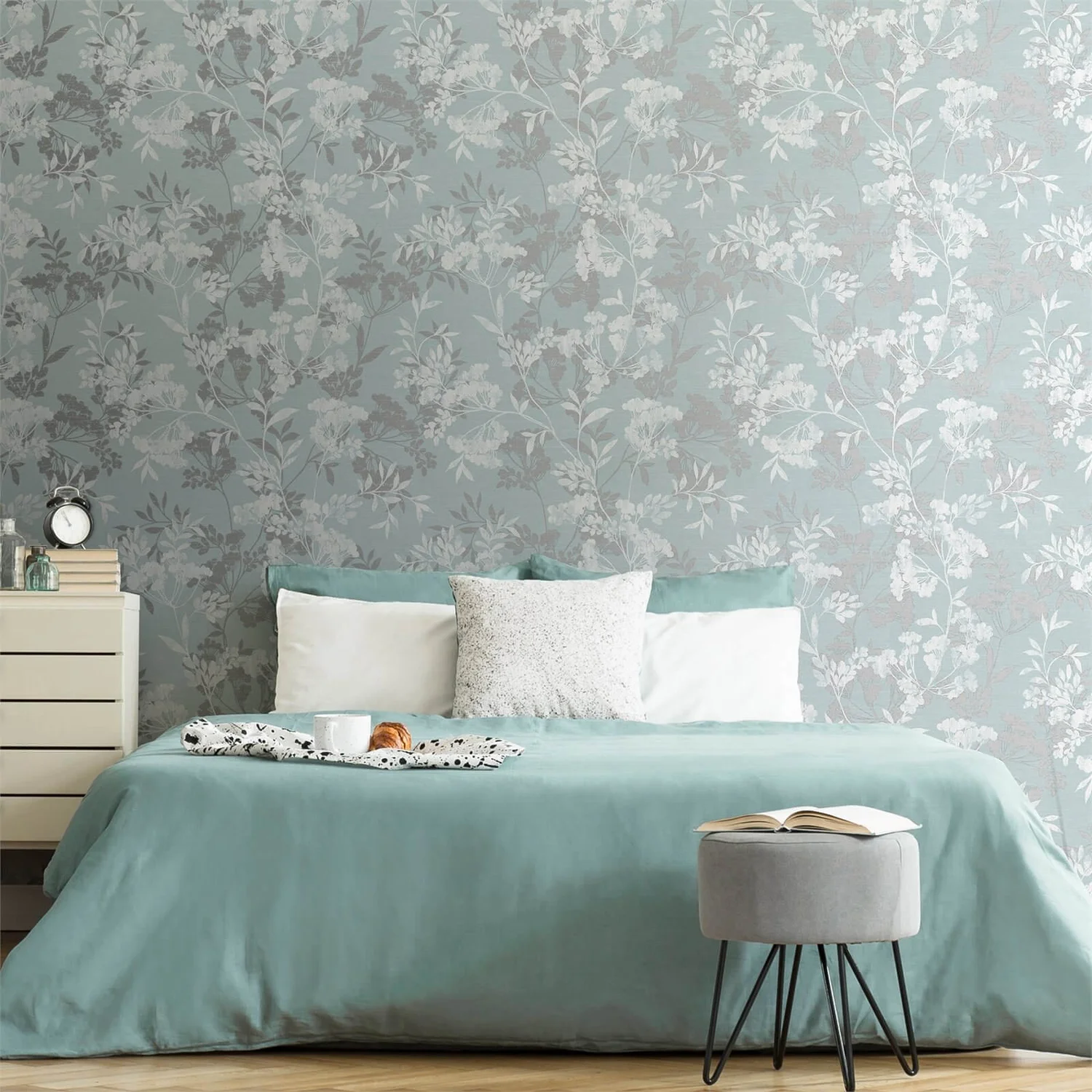 A calming colour scheme and a gentle repeat of floral silhouettes is the perfect wallpaper design for any room that you want to add a sense of peace and serenity to.