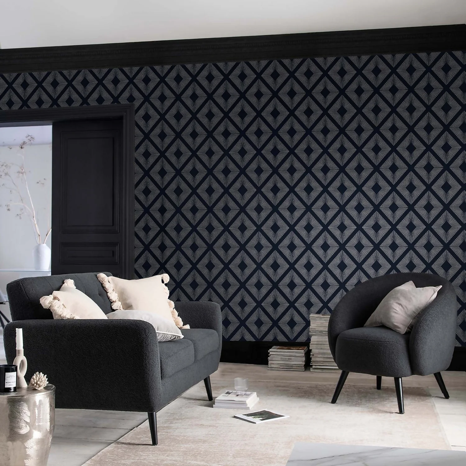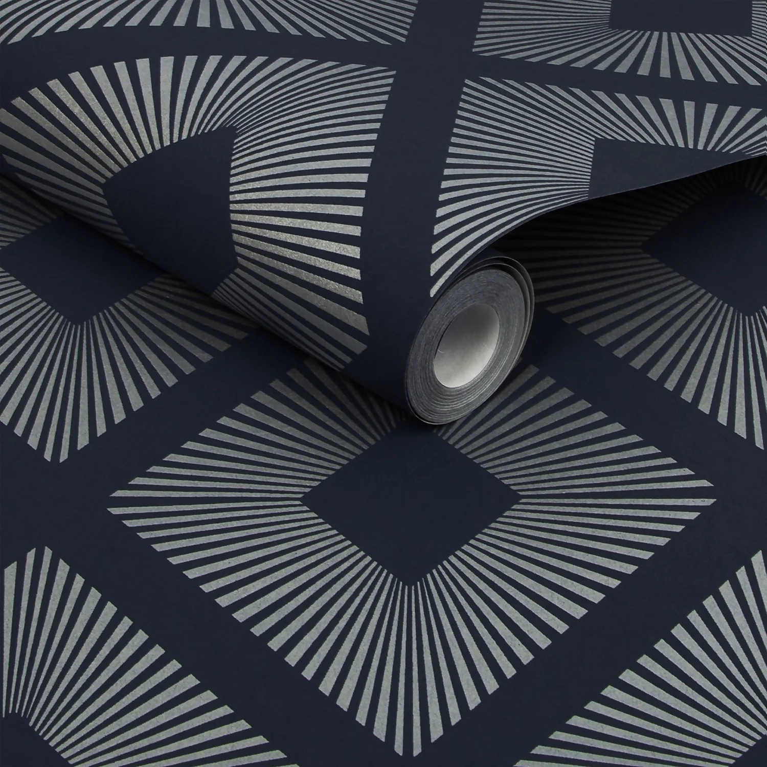 Add luxury and glamour to your walls with Deco Triangle Navy, this glamorous wallpaper design features a maxi geometric triangle in a statement silver metallic beautifully sat upon a deep navy background. Adding even more luxury, this statement design is printed on a fibrous paper which adds subtle texture whilst also being paste the wall meaning easy to hang.
