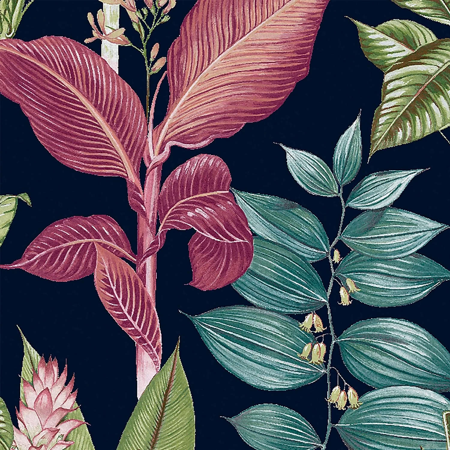Turn your interior into a tropical haven with the Fantasy Rainforest Leaves wallpaper. This colourful, bold design is perfect to create an on trend focal point in the home. Featuring a stunning colour combination of deep plums, greens, pinks and blues each is perfectly showcased upon a deep navy-blue background. Printed on matt paper this design has a contemporary finish whilst also being paste the wall making this wallpaper easy to hang.
