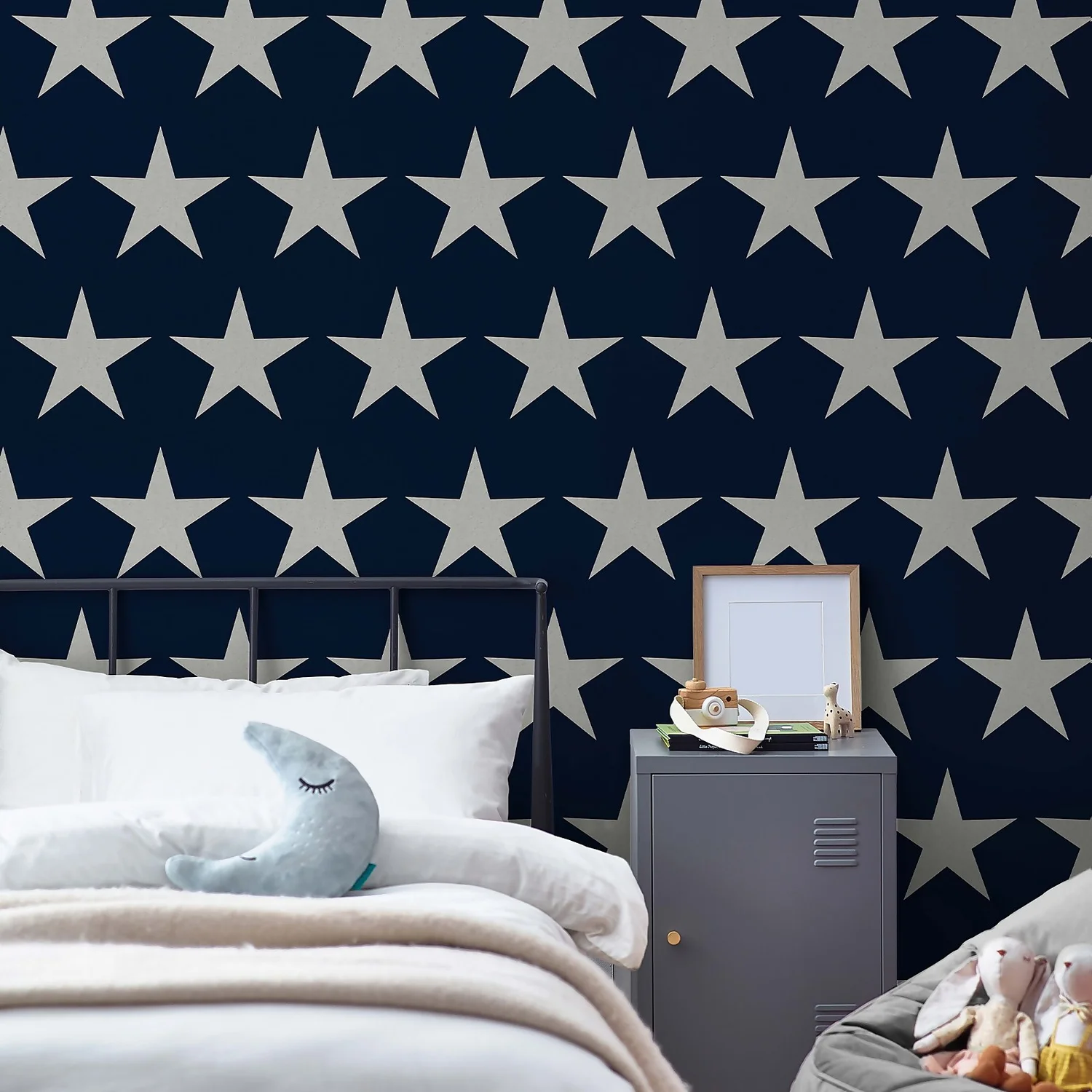 Stars navy blue will add character and style to any children’s room, an iconic star print comes to life in a bold and fun colour combination of deep navy blue with distressed effect off-white stars. Printed on a matt paper for a modern feel, this wallpaper is also paste the wall making it easy to hang.