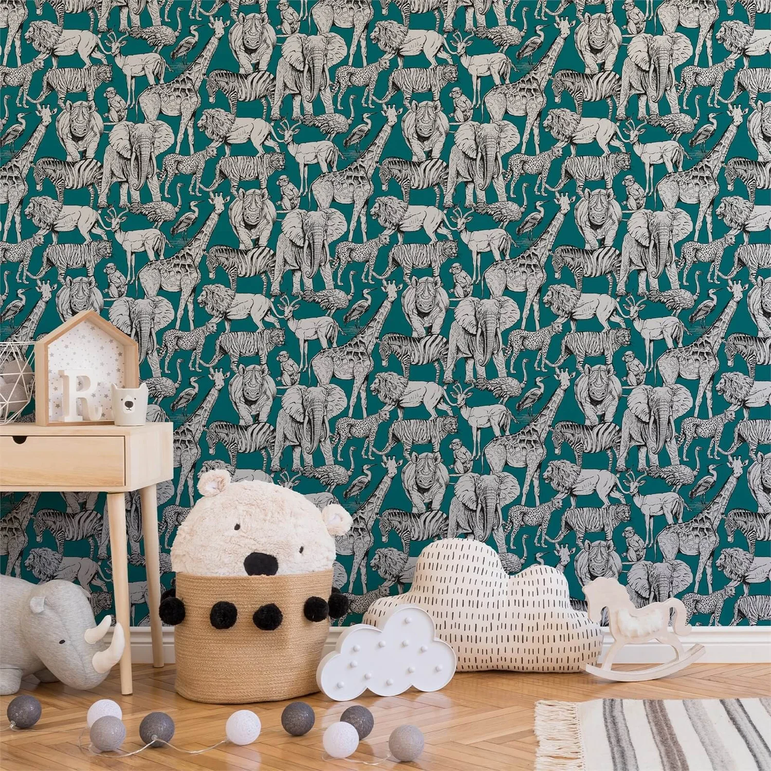 Featuring all the best loved safari animals, Jungle Animals is an illustrative design on an on-trend teal backdrop. A compilation of giraffes, zebras, elephants, rhinos, monkeys and more; this beautiful unique design will add a touch of safari beauty wherever it is used.